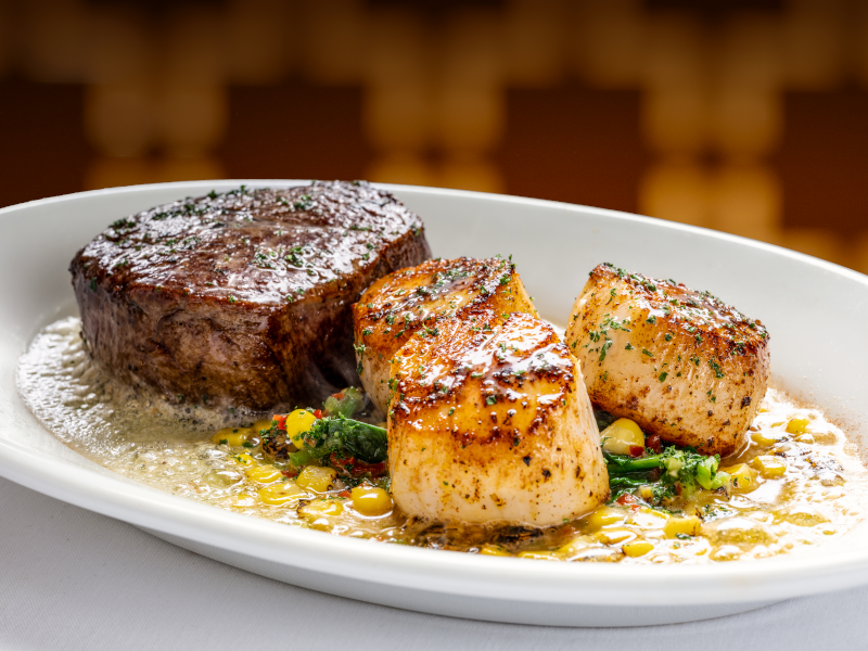 tender 8 ounce filet paired with three blackened sea scallops