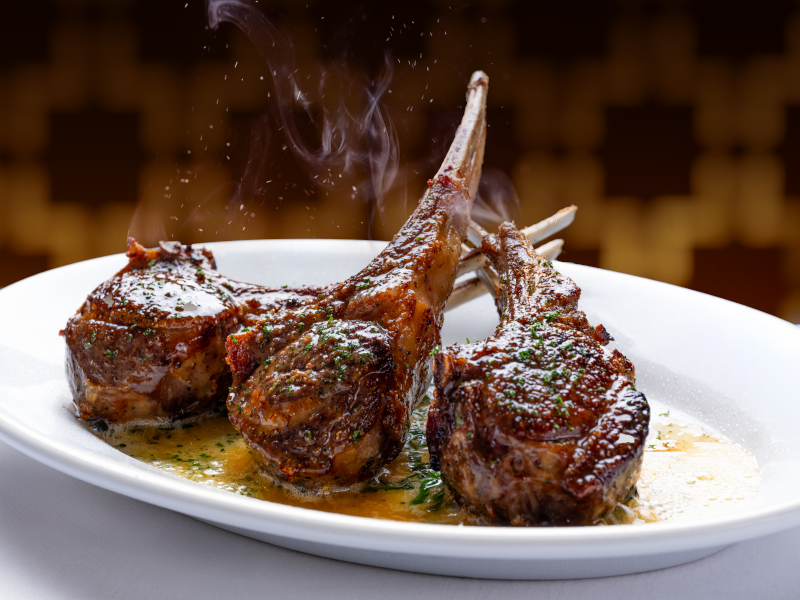 This season, we’re featuring a filet topped with three succulent blackened scallops, perfectly seared and served over sweet corn and spinach – a pairing that unites the richness of steak and shellfish in one beautifully balanced entrée. We’re also highlighting our extra-thick lamb chops, marinated overnight and finished with fresh mint – a bold, flavorful classic that always makes an impression.